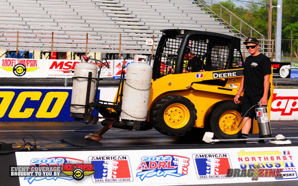 The ADRL starting line crew has just completed scraping the first 50 feet of the starting line. Next will be the traction compound. With weather currently cool and sunny, expectations are for a stellar day of performances. Qualifying will begin today at noon sharp. It's a chamber of commerce weather day here at Maple Grove's Northeast DragsII, so stay tuned for updates throughout the day with accompanying photos and results.