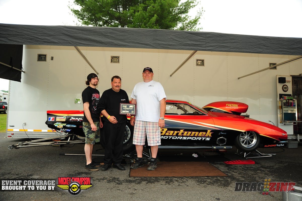 John Bartunek and crew Ed and James Cook accept the Best Engineered award prior to final qualifying Saturday. John sits #14 in Pro Nitrous, and will face Robert Patrick Jr. in round 1.
