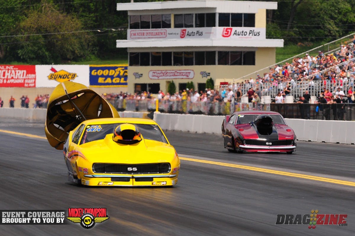 Stan Allen's black Camaro took the top spot in Pro Nitrous with a 3.911/192.74 pass, In the far lane is Tommy Franklin, who is working on a setup after a four year absence from a bad crash at MIR.