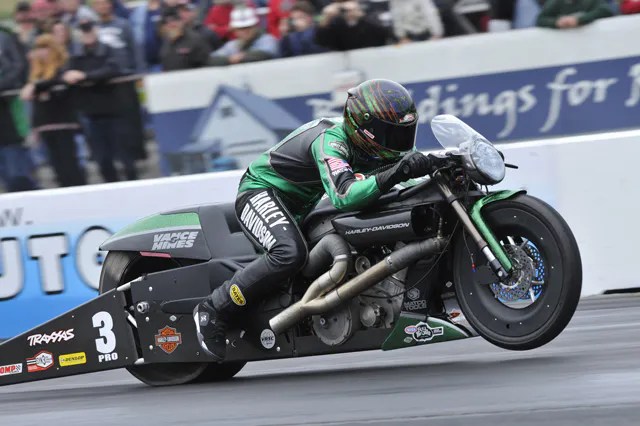 Due to more rain showers moving into the Reading area on Monday afternoon, the Pro Stock Motorcycle final round between the Screamin’ Eagle Vance & Hines Harley-Davidson duo of Andrew Hines and Eddie Krawiec was postponed until the Big O Tires NHRA Nationals in Las Vegas, Oct. 25-28. Prior to the final round, Hines set the national record for elapsed time in this class at 6.720, which earned him a 20-point bonus towards the championship.