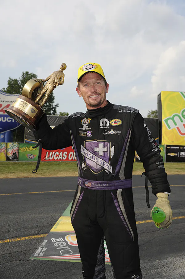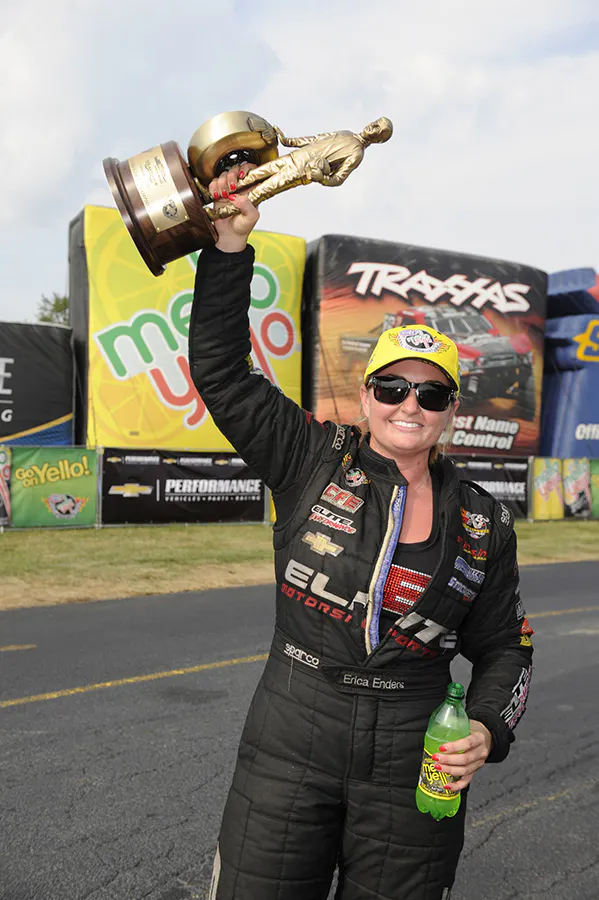 In Pro Stock, Enders claimed her first career Indianapolis victory and sixth win of the season in her Elite Motorsports Chevy Camaro, defeating teammate Drew Skillman in the final on a holeshot with a 6.611 at 209.75 to Skillman’s quicker, but losing 6.606 at 209.98. Enders now has 18 career victories, which ties her for second on the all-time wins list by women in Mello Yello Series competition with the legendary Shirley Muldowney.