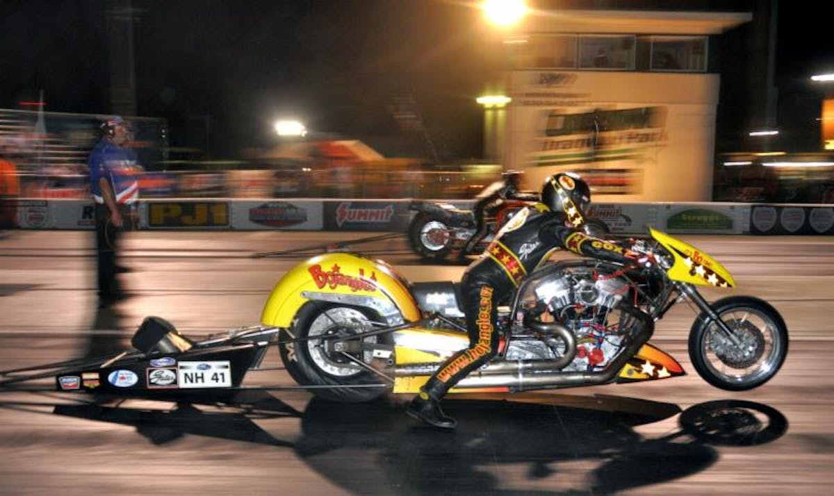 Mark Cox, from Wilkesboro, N.C., claimed his second win of the season in another exciting final in Nitro Harley over Larry Brancaccio.