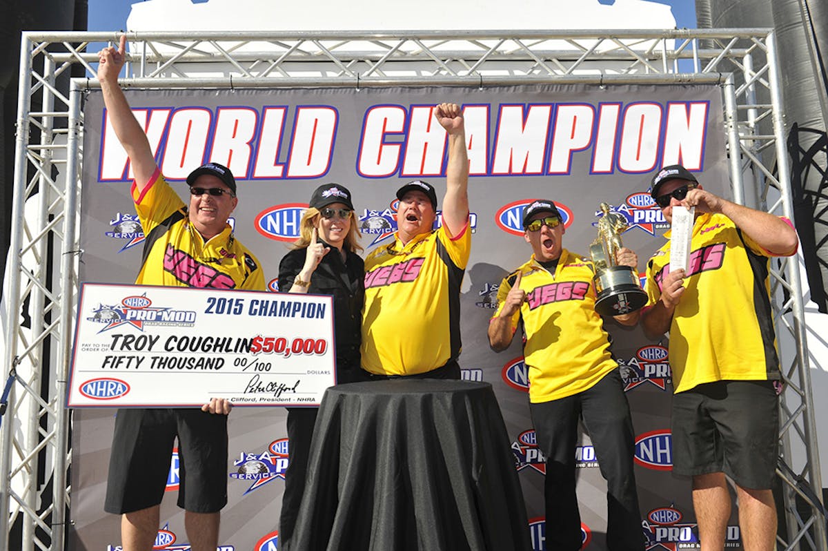Troy Coughlin claimed his second NHRA J&A Service Pro Mod Drag Racing Series world championship title Sunday during the NHRA Toyota Nationals at The Strip at Las Vegas Motor Speedway. This weekend’s Pro Mod racing was sponsored by Aeromotive.