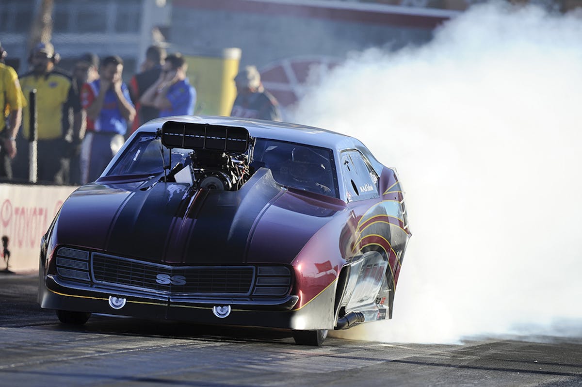 Former Pro Mod champ Khalid alBalooshi powered his Al-Anabi Racing ’69 Camaro to the event victory over Pete Farber. In the final, alBalooshi posted a 6.854 second run at 245.76 mph to finish in front of Farber’s ’69 Dodge Daytona, which trailed with a 6.942 at 244.43. In earlier rounds he outran Rickie Smith, Steven Whiteley and Rick Snavely. It was alBalooshi’s first win of the season and third of his Pro Mod career.