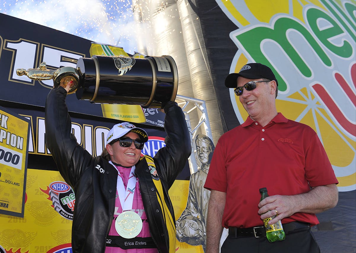 Meanwhile, Enders joined Angelle Sampey as the only women in NHRA history who have successfully defended a world championship title. Sampey won three consecutive Pro Stock Motorcycle crowns from 2000-2002.