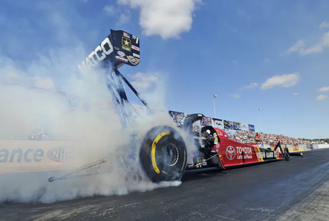 In Top Fuel, Brown claimed his third victory of the season and 40th of his career by defeating Khalid alBalooshi in the final round. Brown covered the distance in 3.788 at 323.97 in his Toyota/Matco Tools dragster to take his second consecutive win at this track, and third overall. Runner-up alBalooshi finished in 3.833 at 319.98 in his Al-Anabi Racing dragster.