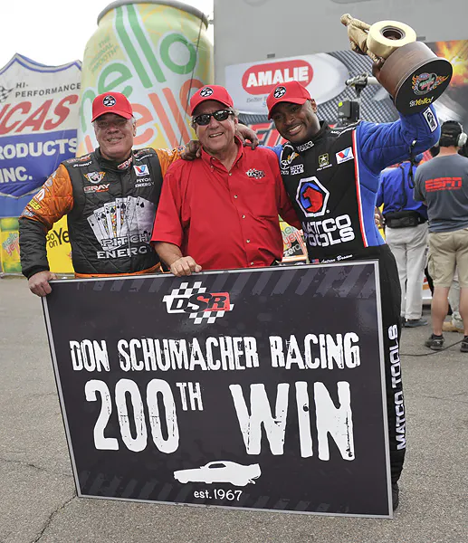 Schumacher earned five of his victories as a driver and 195 have come over the years from a variety of drivers in all four NHRA Mello Yello Drag Racing Series categories. Only John Force Racing has more team victories in NHRA history, with 218, all earned in the Funny Car category.