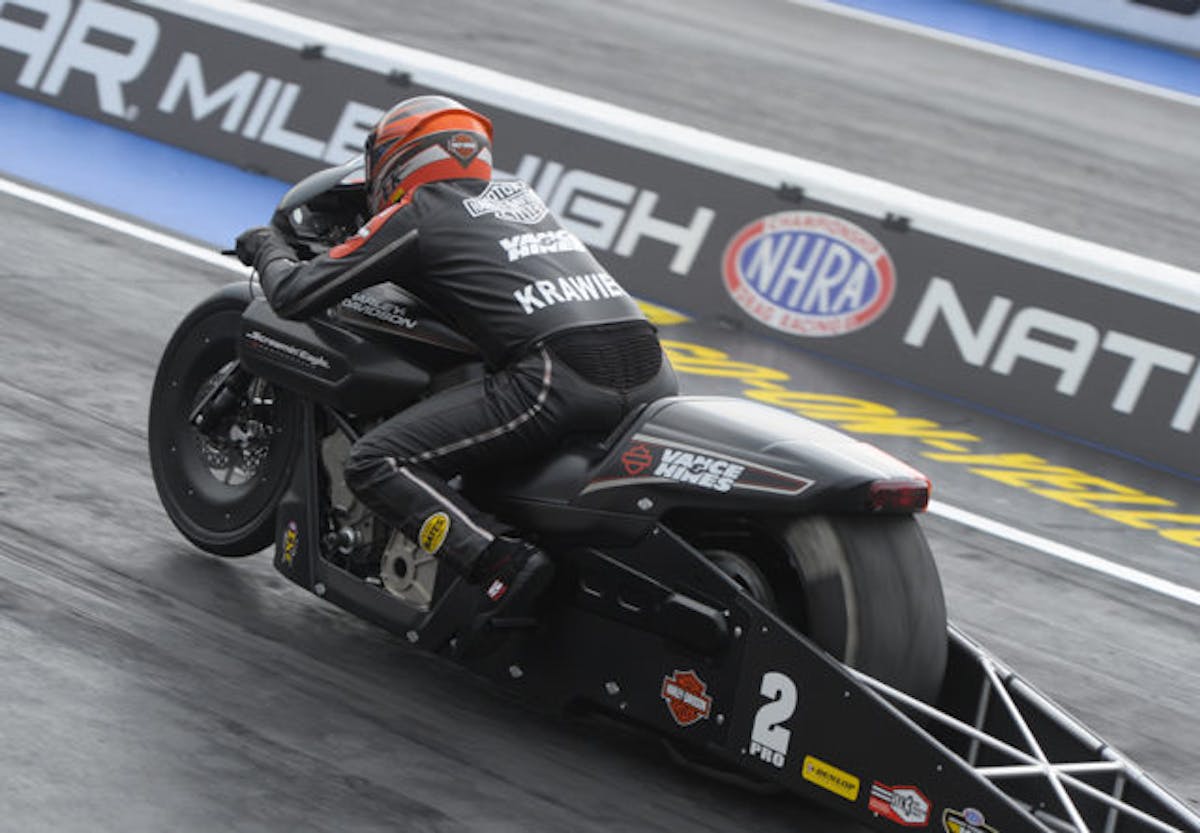 Krawiec finished atop the Pro Stock Motorcycle field with a 7.145 pass at 188.28 in his Screamin’ Eagle Vance & Hines Harley-Davidson to defeat Matt Smith in the final round. After notching his 35th career No. 1 qualifier on Saturday, he earned his second victory of the season and 38th of his career.