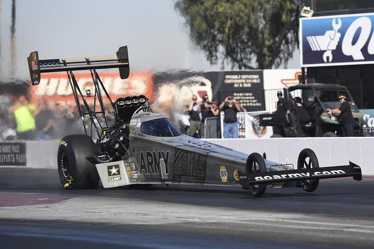 Brown piloted his Matco Dragster to a pass of 3.714 seconds at 328.46 mph to send him to the top of leader board. He was followed by teammate Tony Schumacher in his U.S. Army dragster with his pass of 3.717 at 330.15. Brown won four events in 2017 and is looking wins during the coming season.