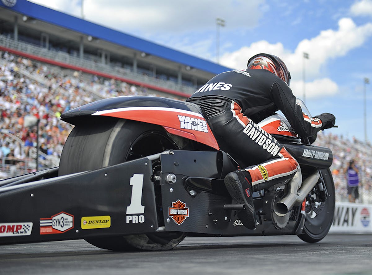 In Pro Stock Motorcycle, defending world champ Hines won this event for the third time, clocking a winning run of 6.880 at 195.11 on his Screamin’ Eagle Vance & Hines Harley-Davidson to Smith’s losing 6.910 at 192.49 on his Victory Racing Gunner. It was Hines’ 40th career victory in the two-wheel category.