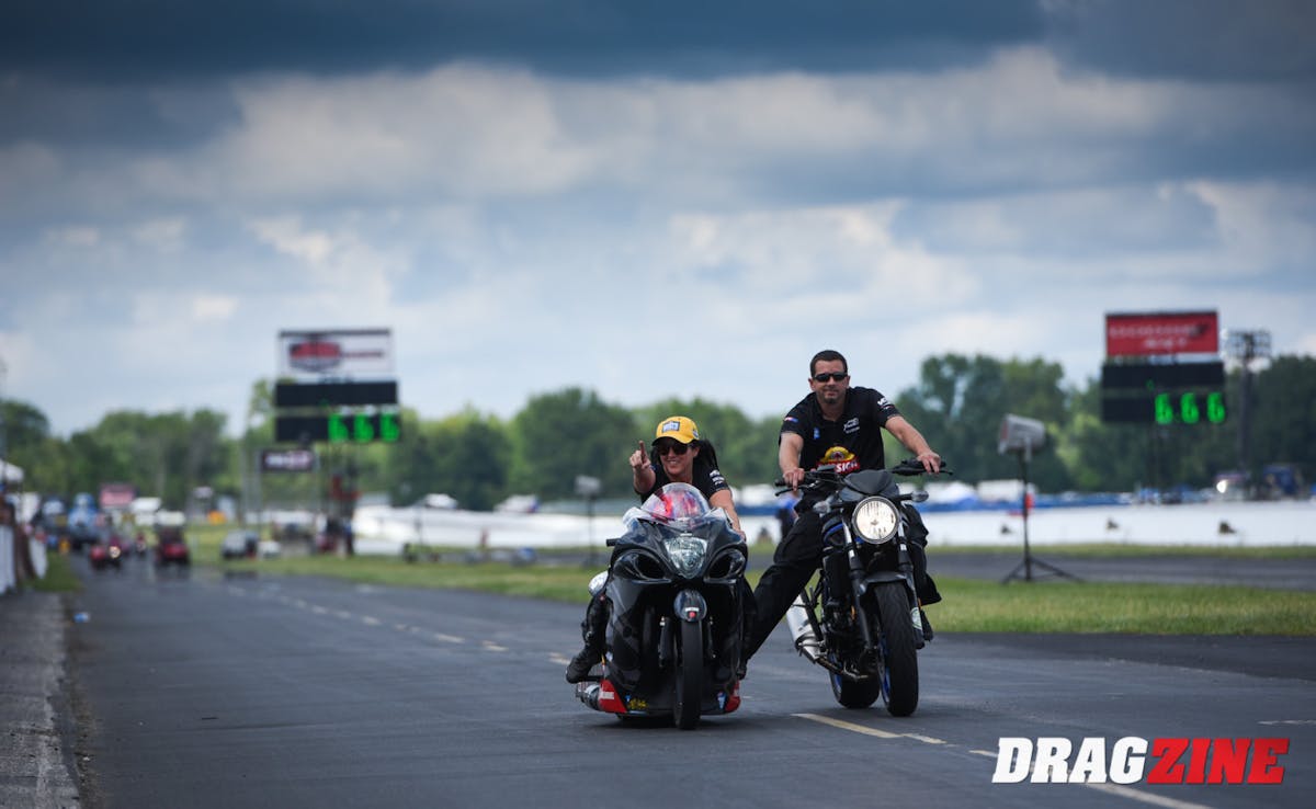 In Pro Stock Motorcycle, Sampey held onto her No. 1 spot from Saturday, clinching her fourth top qualifier of the season thanks to her run of 6.796 at 199.88 on her Mission Foods/Vance & Hines Suzuki. It’s also the 57th career No. 1 qualifier for Sampey, who will try to win the U.S. Nationals for the first time in 20 years. That would wrap up a stellar weekend for Sampey, who is after her third win at the Big Go. She’ll take on Ron Tornow to open eliminations.