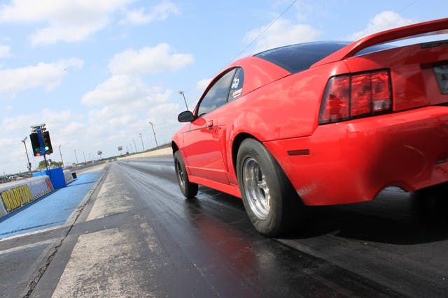 Here Shawn Byrne launches hard on his was way to a mid eight-second run. the 2V powered Mustang has a PT 47/ 88 MM turbo pushing over 30 pounds of boost. Shawn set the modular 2V record in April at Silver Dollar Raceway with an 8.63 @ 162.6 MPH.