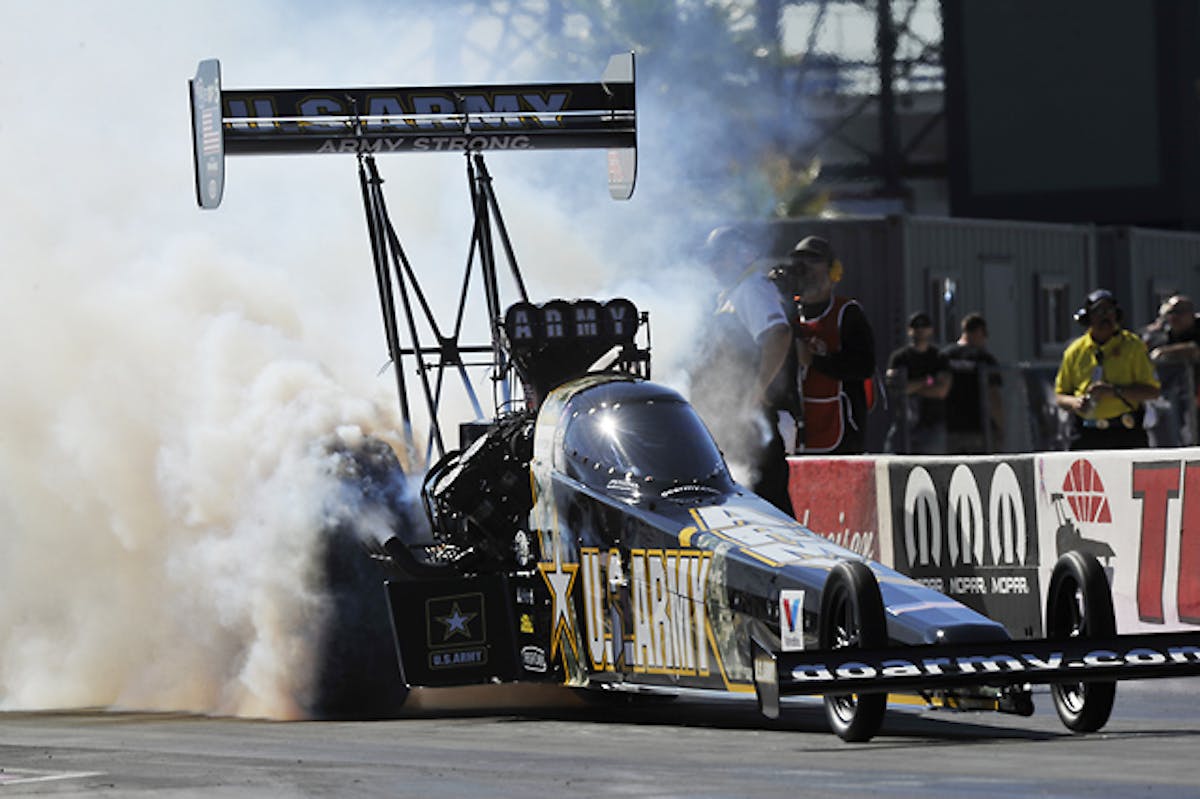 MIRACLE-TIME AGAIN? – Top Fuel runner-up Tony Schumacher heads into the Nov. 8-11 Auto Club Finals at Pomona, Calif., in second place in the Top Fuel class, just 65 points behind leader Antron Brown. The U.S. Army Dragster driver, the No. 1 qualifier, said he had hoped to win this race not only for our troops but also for his son Michael, who turned nine years old Sunday. With his eighth final-round appearance this season, Schumacher improved from third place, passed Don Schumacher Racing teammate Spencer Massey, and sliced other DSR mate Brown’s advantage from 136 points. Schumacher, that master of championship-producing, last-minute miracles in his season finale, said, “We’ve pulled off miracles. You don’t want to wish anyone else a mistake, but if we’re going to be champs it’s required.” But he said Brown would make an excellent champion: “I hope he comes out and makes clean runs and becomes world champion. He’s earned it.”