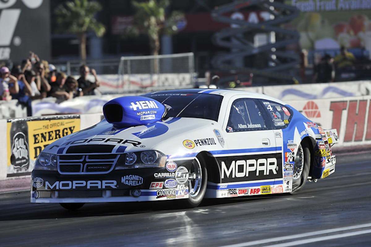 LOCKED IT UP? – In Pro Stock, Team Mopar/J&J Racing’s Allen Johnson all but secured his first series championship. He defeated fellow finalist Vincent Nobile, who drives the Mountain View Tire Dodge Avenger with power from Johnson’s dad Roy Johnson. for team owner Nick Mitsos of Rancho Cucamonga. Johnson heads to Pomona with a 126-point advantage over second-place and reigning champion Jason Line. “We wanted to come down on that championship with an iron fist,” Johnson said in winning for the sixth time this year in 10 finals.