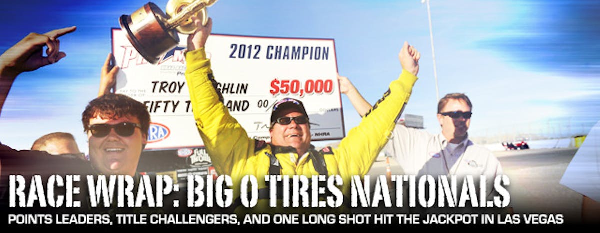 Think of the National Hot Rod Association’s Big O Tires Nationals at The Strip at Las Vegas Motor Speedway as a Countdown casino. All the contenders came in feeling lucky. Two of the pro-class points leaders, one serious challenger, and one long shot hit their respective class jackpots. One points leader rolled snake eyes. And a few hopefuls gambled and lost, while drag racing merely teased a couple of others before dashing their hopes. Find out who Sunday’s winners and losers were.