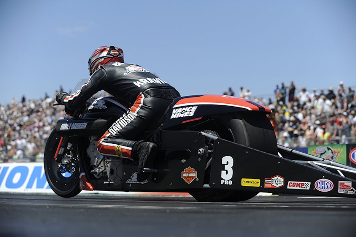 Krawiec grabbed his second Pro Stock Motorcycle victory of 2014 with a 6.854 at 193.99 on his Screamin’ Eagle Vance & Hines Harley-Davidson, beating No. 1 qualifier Jerry Savoie in the final. The win was the 24th career victory for Krawiec, a three-time Pro Stock Motorcycle world champ.