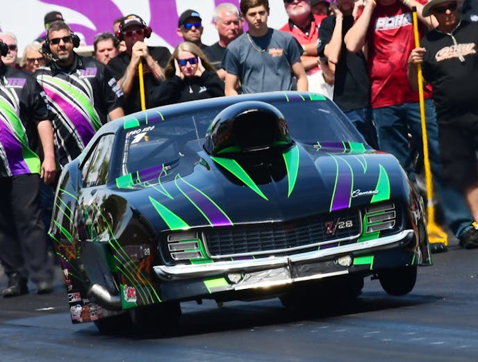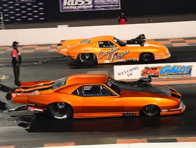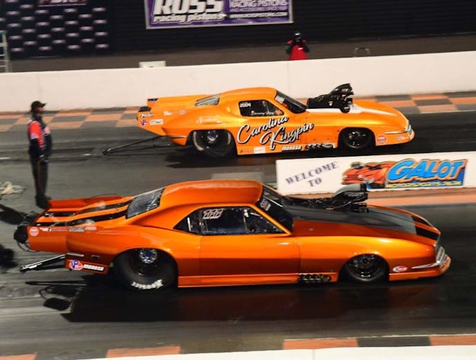 Jay Cox and his Buck-powered “Pumpkin” ’69 Camaro made a strong opening statement in the Flatout Gaskets Nitrous Wars when the local favorite uncorked three of the quickest passes in Pro Nitrous history to win the East Coast Spring Nationals. In the final round against Jason Harris and the “Party Time” ’69 Camaro, Cox left the starting line first and maintained his lead through the finish line, posting a 3.696 at 201.31 mph to beat Harris’s 3.74 at 201.07.
