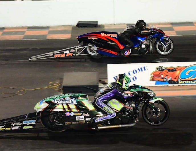 Williford qualified No. 5 in the 16-motorcycle field and charged to 4.0-second passes over Burke Forster, Tommy Saxon and Terry Schweigert. Grothus qualified No. 2 aboard his Indocil Art Hayabusa and was unopposed in the first round before recording a pair of 4.02s to take down defending world champion Travis Davis and Ronnie Smith.
