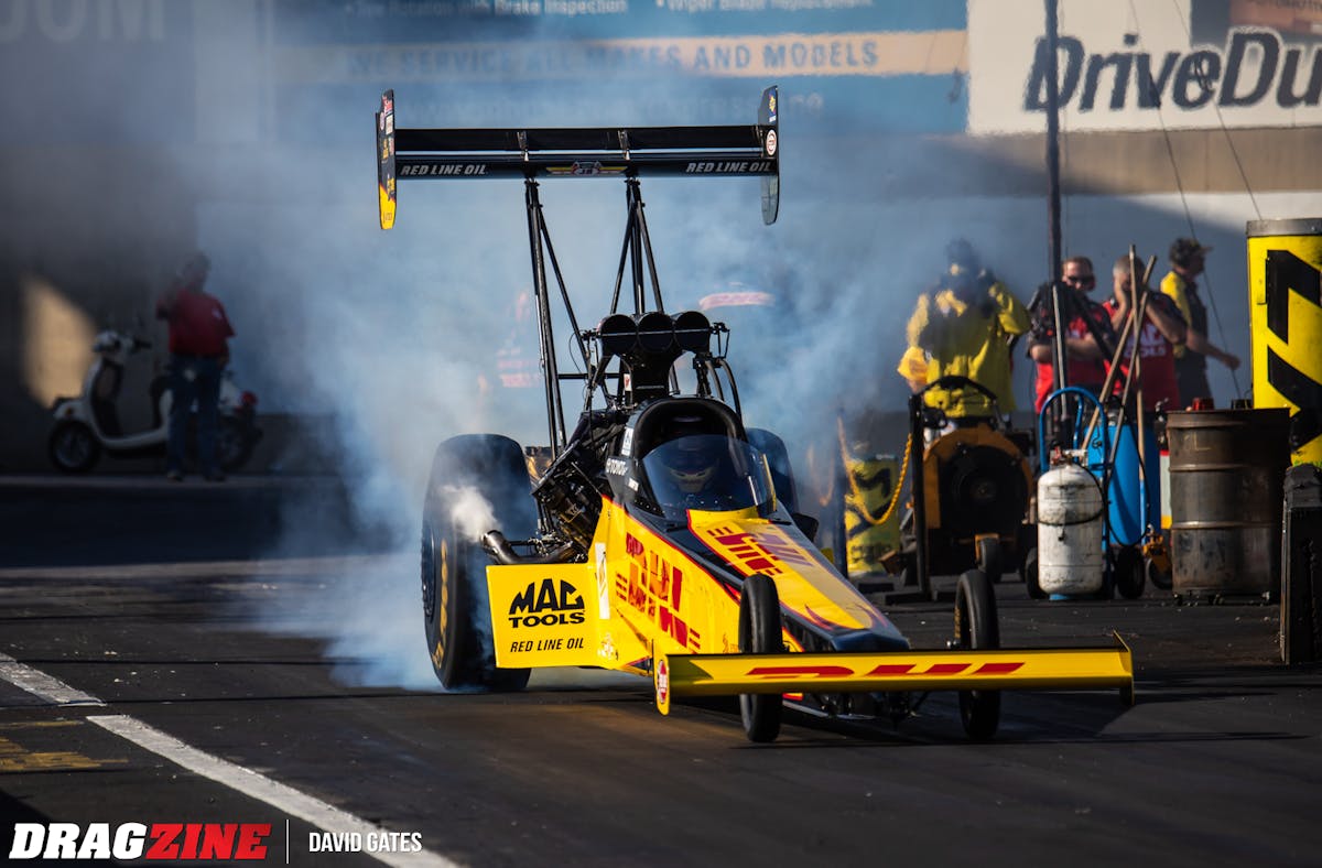 It was a battle of Kalitta Motorsports in the Top Fuel final round but it was Crampton who raised the Wally trophy when he defeated his teammate Doug Kalitta with his 3.738 pass at 329.10 in his DHL dragster. Crampton now ties team owner and NHRA legend Connie Kalitta with 10 career wins.