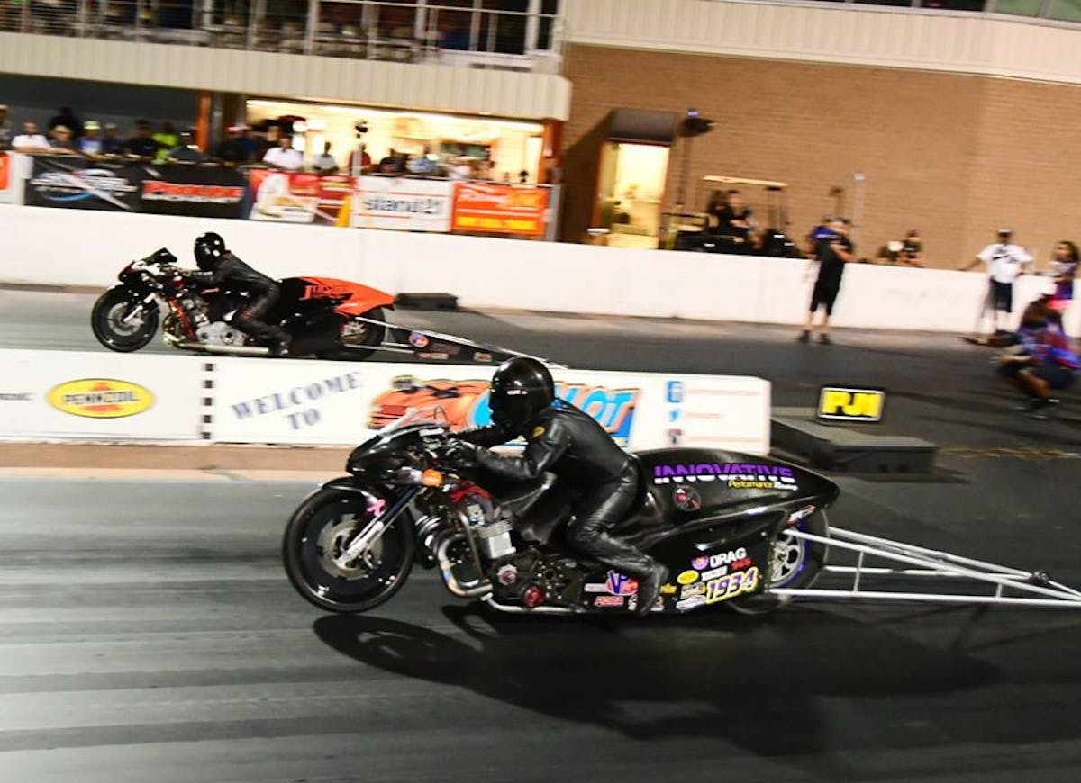 Ronnie “Pro Mod” Smith went wire-to-wire to enjoy his career-best weekend in the PDRA’s Pro Extreme Motorcycle class riding his Innovative Performance ’16 Suzuki to progressively quicker passes from the No. 1 spot. Smith’s final shot was a 3.997 at 175.59 over Chris Garner-Jones and his 4.08 at 173.83.