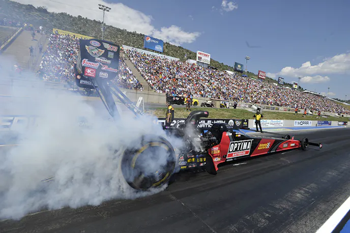 In a battle of young guns, J.R. Todd scored his first victory in Top Fuel since 2008 (and his first driving for Kalitta Motorsports) when he drove around Brittany Force on Sunday afternoon at the Mopar Mile-High Nationals at the Bandimere Speedway, 3.87 to a 3.96, notching his seventh career win and denying the youngest Force sister of her first victory. In Funny Car, Robert Hight collected his fifth win of the season, defeating boss John Force, who smoked the tires, in the final round. Allen Johnson continued his domination on the mountain at his primary sponsors’ race, winning at Denver for the sixth time, driving from the No. 2 qualifying position to defeat teammate Jeg Coughlin in the final with a 6.93-second lap. And in Pro Stock Motorcycle, the Vance & Hines Harley-Davidson team racked up another win on the season, as Andrew Hines ousted Michael Ray in the final, 7.24 to a slowing 9.03.
