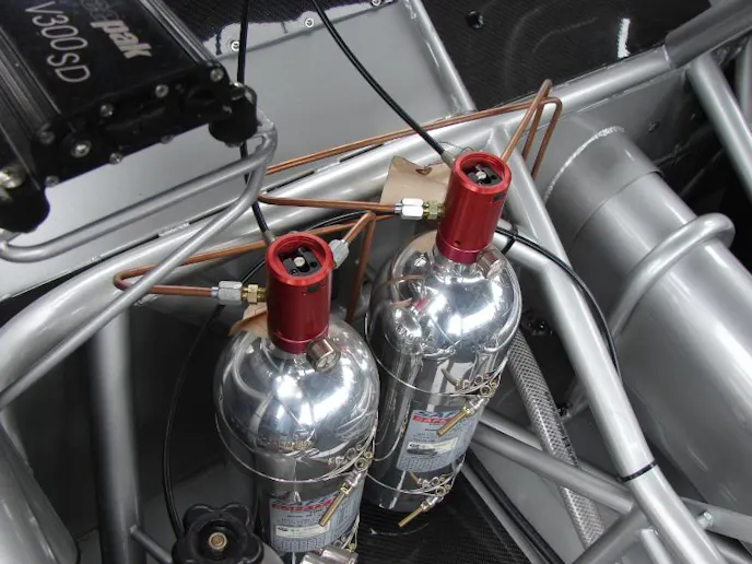 The supercharger exploded, blowing it right off the car and rupturing a fuel line in the process, sending alcohol everywhere that quickly ignited. He continued “the shipping screws were still in the fire bottles, and this thing was on fire and had 18 gallons of fuel in it.  I wasn’t going to crawl back in the car to try to pull the screws off. We attempted to, but after looking at it, it was getting worse and worse and so we gave up on the idea.”