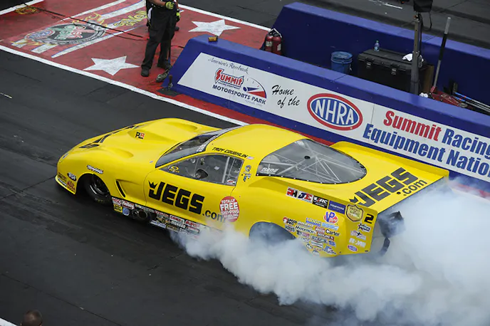 Troy Coughlin took the final round victory at the controls of his turbocharged JEGS.com Chevy Corvette, beating Von Smith and his supercharged Al-Anabi Racing Camaro with a holeshot performance of 5.940 seconds at 250.92 mph. Smith, who has been in three final rounds this season with one win, managed to close the gap at half-track but finished with a 5.920 at 243.99. This is Coughlin’s first victory at his home track.