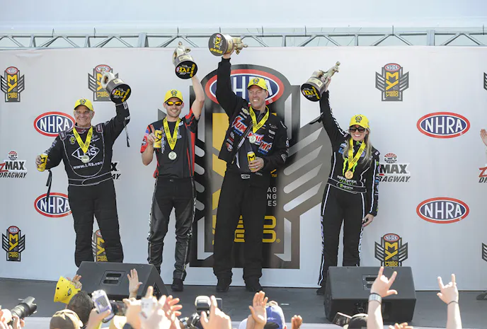 Tim Wilkerson (Funny Car), Jason Line (Pro Stock) and Andrew Hines (Pro Stock Motorcycle) also were winners at the distinctive NHRA Mello Yello Drag Racing Series event where teams compete in a four-lane format.