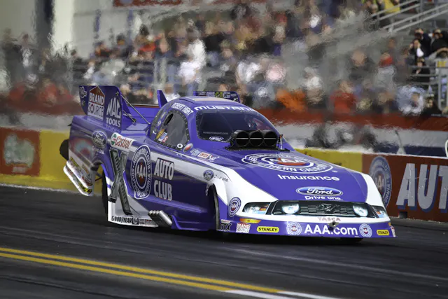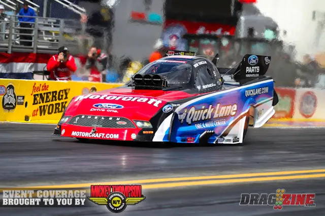 In Funny Car, Tasca powered his Motorcraft/Quick Lane Ford Shelby Mustang to a run of 4.107 at 308.21 mph to qualify in front of fellow Mustang driver Robert Hight, who posted a 4.110 at 301.33 in his Auto Club Ford. Local favorite Matt Hagan was third with a 4.112 at 303.50 in his DieHard Dodge Charger.