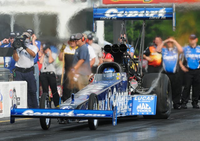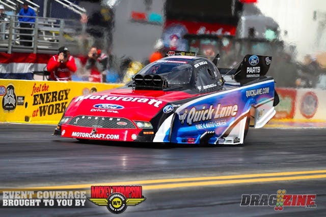 In Funny Car, Tasca powered his Motorcraft/Quick Lane Ford Shelby Mustang to a run of 4.107 at 308.21 mph to qualify in front of fellow Mustang driver Robert Hight, who posted a 4.110 at 301.33 in his Auto Club Ford. Local favorite Matt Hagan was third with a 4.112 at 303.50 in his DieHard Dodge Charger.