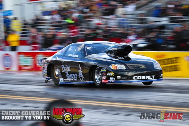 Edwards claimed his third consecutive Bristol Dragway win and 30th of his career and in the process denied Erica Enders a milestone victory as she tried to become the first woman to win in the history of the 41-year-old factory hot rod category. Enders left the starting line first in her ZaZa Energy Chevy Cobalt, but the car lost power near midtrack while Edwards sped down the track to finish in 6.685 at 205.79 in his Penhall/Interstate Batteries Pontiac GXP.