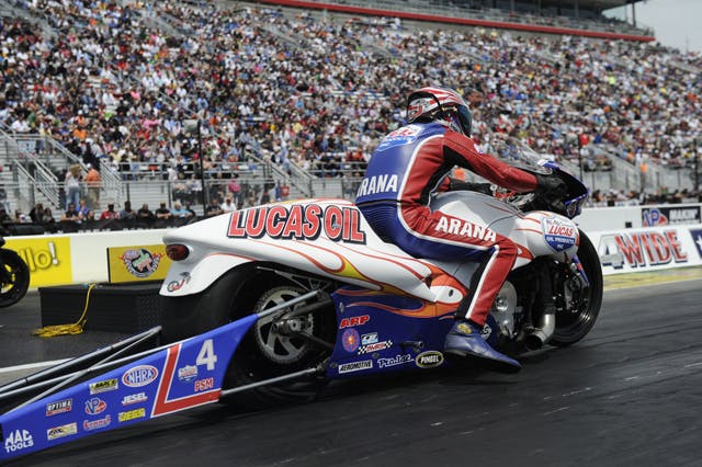 In Pro Stock Motorcycle, Arana Jr. claimed his second straight victory of the season and fifth of his career with a final round performance of 6.896 at 190.73 to defeat defending world champ Eddie Krawiec, who rode his Harley-Davidson to a 6.924 at 190.65. The semifinalists in the four-wide final were Scotty Pollacheck and Jim Underdahl.