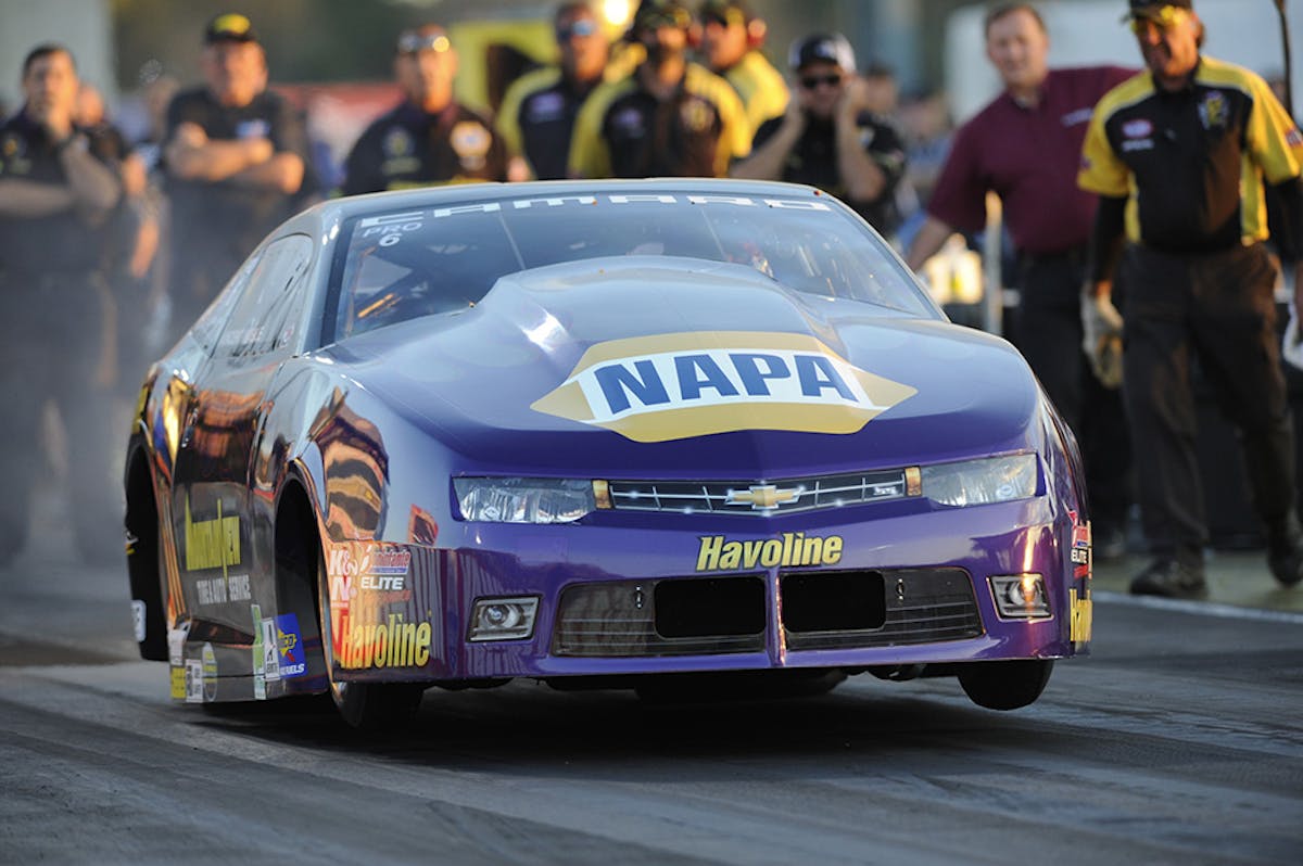 Sixteen time Funny Car world champion John Force is fourth in his Peak Chevy Camaro SS and followed by teammate Robert Hight and his Auto Club of Southern California Chevy Camaro in fifth. Tommy Johnson Jr. is sixth and reigning world champion Del Worsham is seventh.