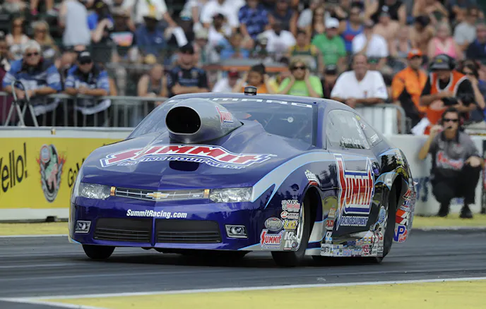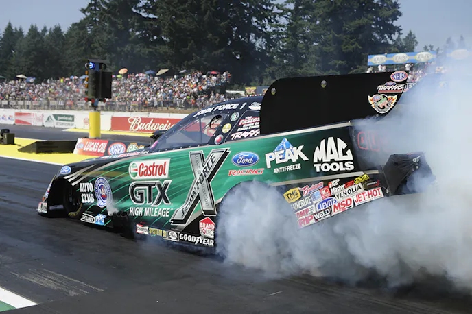 Force defeated former teammate Gary Densham in the final round for his 141st career win. Force registered a run of 4.173 seconds at 302.48 mph in his Castrol GTX High Mileage Ford Mustang to defeat Densham’s trailing Chevy Impala, which lost traction early in the run and finished in 5.808 at 120.44. Force has raced to four consecutive finals and has won twice in that stretch.