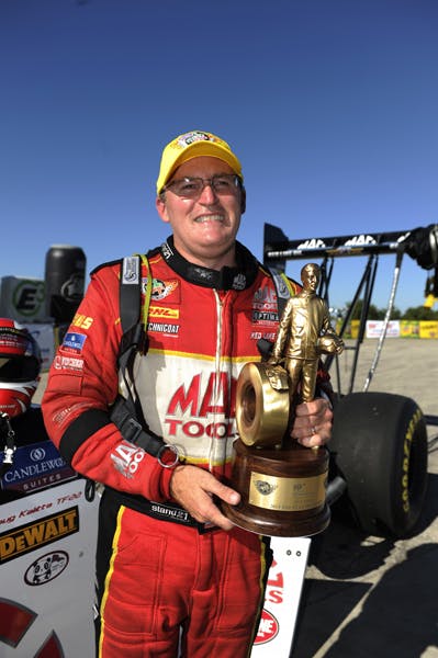 Kalitta claimed his first victory of the season and first since 2010 in Top Fuel, and moved into a tie for the NHRA Mello Yello Series points lead with the driver he beat in the final round, Shawn Langdon. Kalitta powered his Mac Tools dragster to a run of 3.842 seconds at 320.42 mph to hold off Langdon’s Al-Anabi Silver dragster, which finished in 3.896 at 291.32.