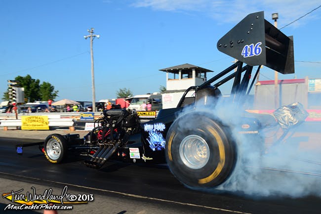 Two night time qualifying sessions were run under the lights on Saturday with some spectacular results. The most hair raising moment of the night occurred when Donny McSwain’s “Wild One” blown alcohol machine made a hard move across the centerline, resulting in a stiff impact with Mary Reep’s “Grim Reeper” entry as the cars passed half-track. In an unbelievable outcome, the rear wheel of McSwain’s car lined up identically with Reep’s rear wheel with both cars under full power, resulting in quite minimal damage to both entries and most importantly a safe exit from the racecars by both drivers.
