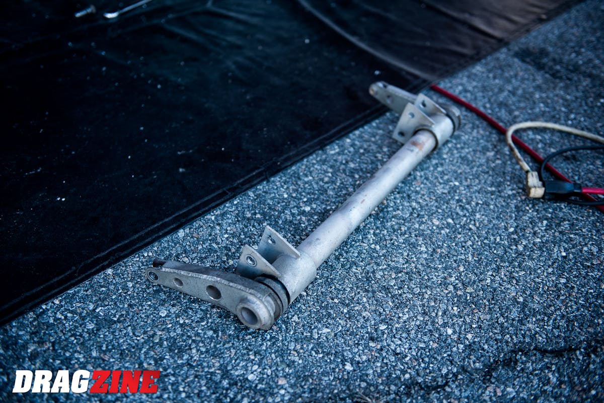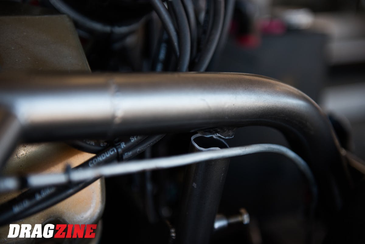 “The upper right 4-link bar was bent pretty good, and the wishbone. We have stuff for that if we can get the snout bar and frame rail up front squared away. Right now we’d consider it a win to be able to go back to the starting line with it and it do what it’s supposed to. The guys from Tydo Race Cars have no quit in them, so we’ll hopefully make it back tomorrow and can make some short hits in testing to check it all out and make sure it works like it’s supposed to.”
