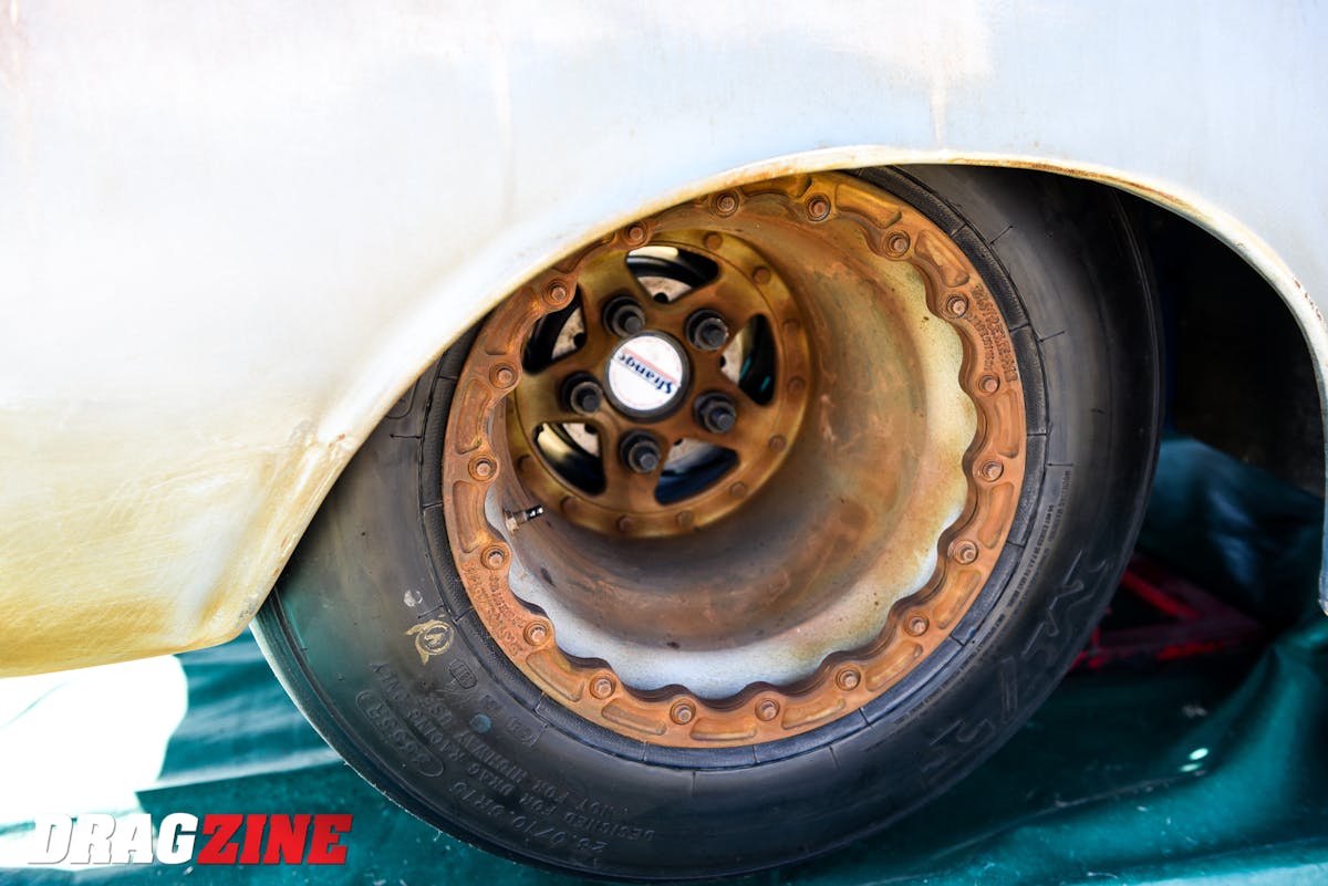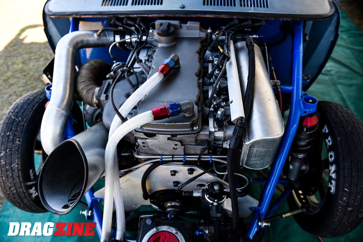 The VR6 was originally intended for a front-wheel-configuration, so McBride devised a. Inversion kit to swap it to rear-wheel. A Reid Powerglide transmission sends the power to a 6600 rpm stall converter, and custom fabricated 9-inch rear end housing.