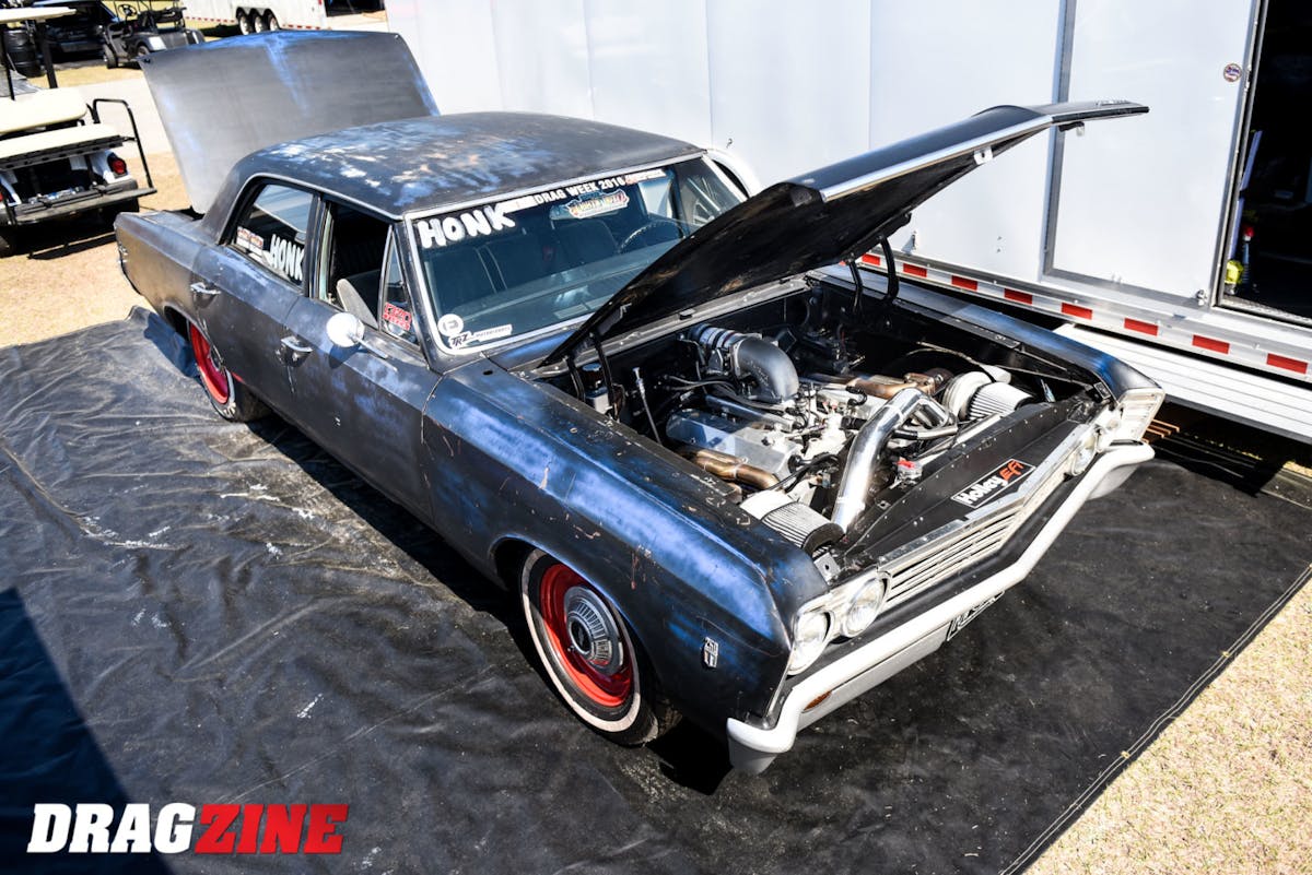 Rick Steinke trekked down all the way from his home in Holland, Pennsylvania with a fresh new combination to compete in the Limited 235 category this week. His 1967 Chevelle, aptly named “Honk If Parts Fall Off” — an ode to its patina’ed appearance — is sporting a pair of turbochargers for the first time. The single 88mm was swapped out for a pair of 71mm BorgWarners feeding the 421 cubic-inch small-block Chevrolet.
