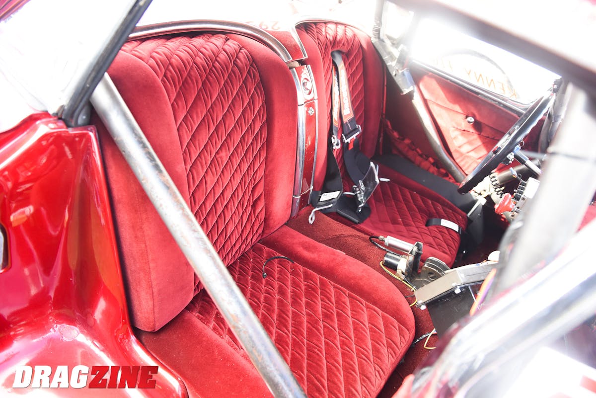 The ‘Vette retains the original body from nose to tail — save for a lighter-weight hood Floyd has made in recent years so he can lift it on and off easier. The firewall and floor pan are likewise original. Floyd had the car re-painted its candy red hue in 1986. Floyd made the seats bey hand from foam and upholstered the interior in a classic suede-like red trim to match. Power is compliments of a 400 cubic-inch small-block with a Dart block, Trick-Flow 18-degree aluminum heads, and a roller camshaft, on alcohol, transferring to a Powerglide transmission and Dana 60 rear end with 5.13 gears.
