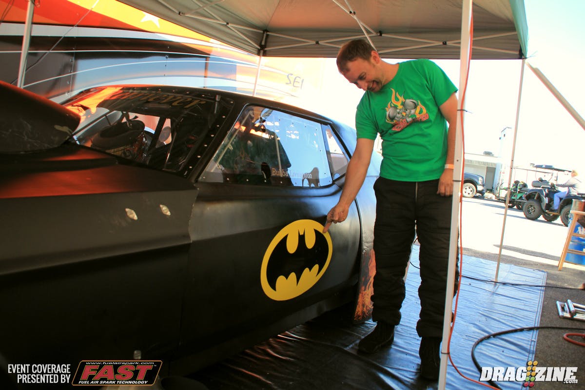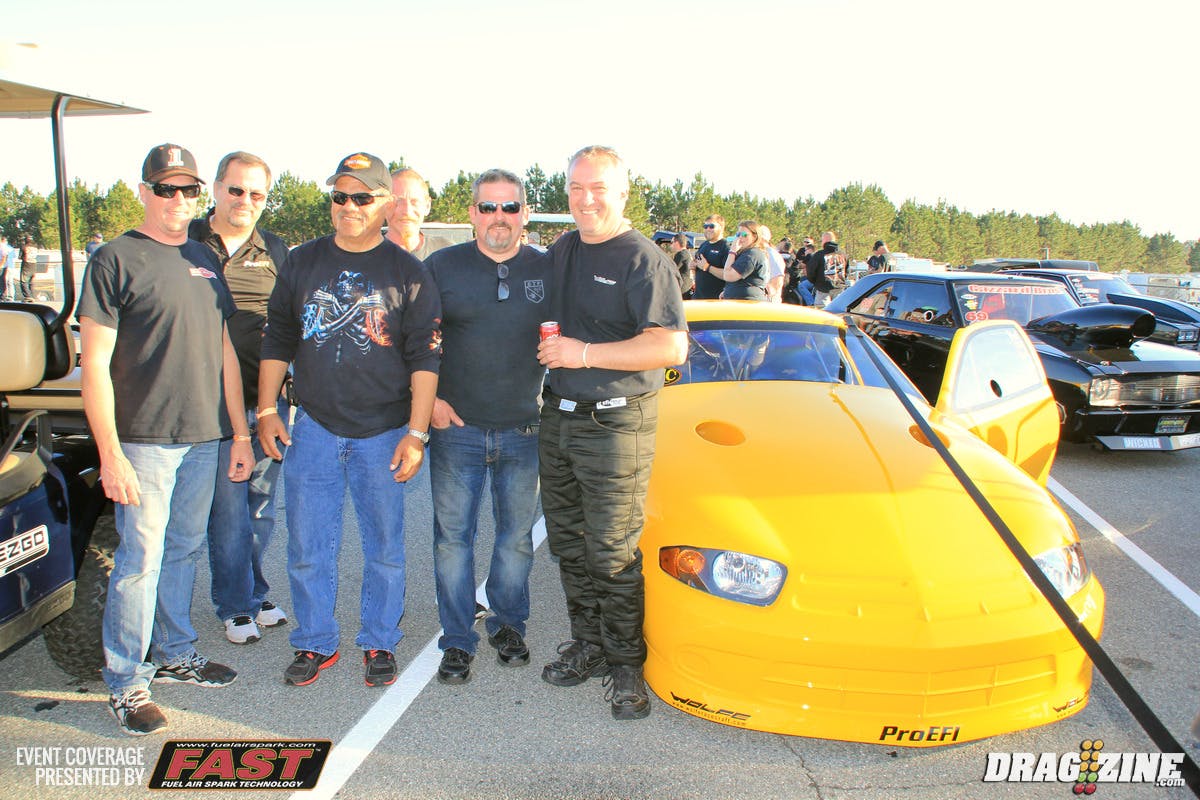 Justin Harris is here with his new Darth Vader Mustang running X275 parked in the far front corner. The car is a fresh build with no testing prior to the event. It's powered by a big Chevy from PAR Racing Engines topped with Fast Lane Nitrous tuned by Chris and Chase Johnson at JPC Performance Center. From left to right; Chase Johnson, Kevis Adams, Justin Harris owner/driver and Thaddus Simmons.