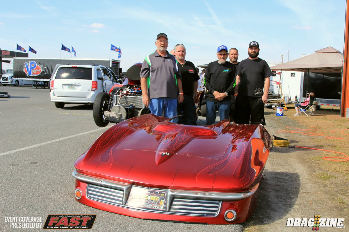 Shay Loveday has struggled keeping their car on the ground in Radial vs the World and have made some adjustments and added some weight on the nose to help out. The 63 Vette is owned by Steve Dodgen and is one of several cars in the D&L Racing stable. The team has run this Mark Posley built car about 3 years in local Pro Mod events with a 632 engine but pulled this Eagle Racing Engine 780 ci off the shelf about three weeks ago to prepare for this event.