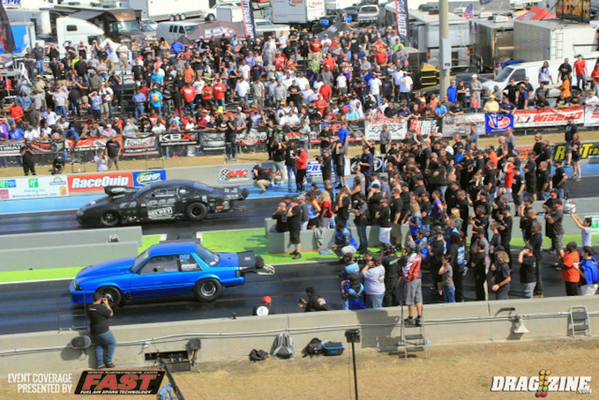 Barry Mitchell (far lane) is running well in his new car debut sporting an 800 cubic inch beast from Fulton. His best was in Q2 of Outlaw Drag Radial with a 4.17 at 181 putting him second in class.