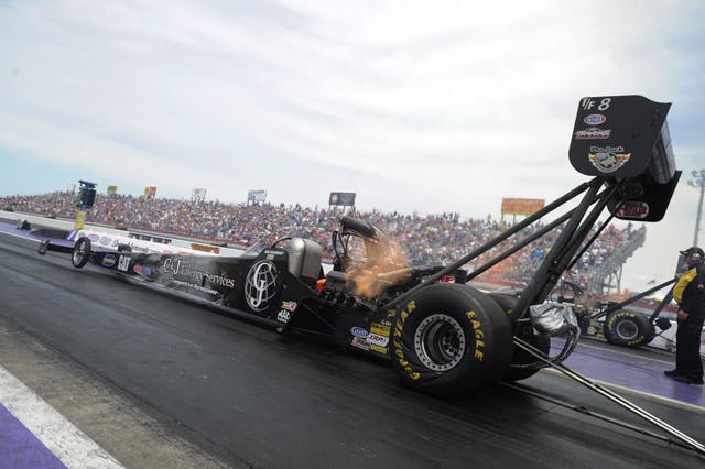 LIVING LARGE IN TEXAS – Top Fuel winner Bob Vandergriff had a simple strategy. “We kept letting everybody beat themselves,” Vandergriff said. Meanwhile, he said, “We kept pecking away at it and pecking away at it. They gave us enough chances to get it straightened out, and we made a really good run in the final for the conditions.” It was his first victory this season and third overall. “We made enough changes to get the car to the finish line under power,” he said after using a 3.904-second, 316.38-mph blast in the C&J Energy Services Dragster to easily defeat tire-smoking Shawn Langdon.