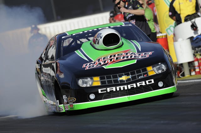 LUCKY LINE GETS 30TH WALLY – In his first Pro Stock final this season, Jason Line scored his first 2013 victory. Luckily for the KB/Summit Racing Equipment Camaro driver, he launched first on opponent Shane Gray with a nearly perfect .007 reaction time and won although the two registered identical 6.589 elapsed times and 211-mph speeds. The march to his 30th victory began with a close call, as he defeated Matt Hartford by a mere .0002 of a second (two-10,000th-of a second) in the first round.
