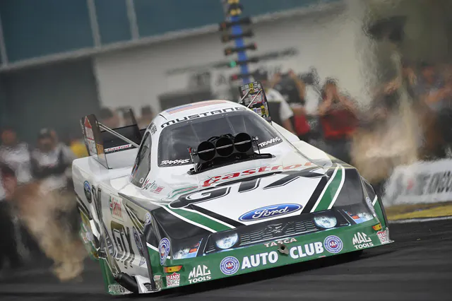 Leah Pruett started from the seventh qualifying position and advanced to the quarterfinals with her quickest pass of the weekend, 5.916 seconds at 250.83 mph, outrunning Steve Matusek’s Mustang in the process. Raymond Commisso, Mike Knowles, Kenny Lang, Donald Martin, Rickie Smith and Danny Rowe also advanced to the quarterfinals.