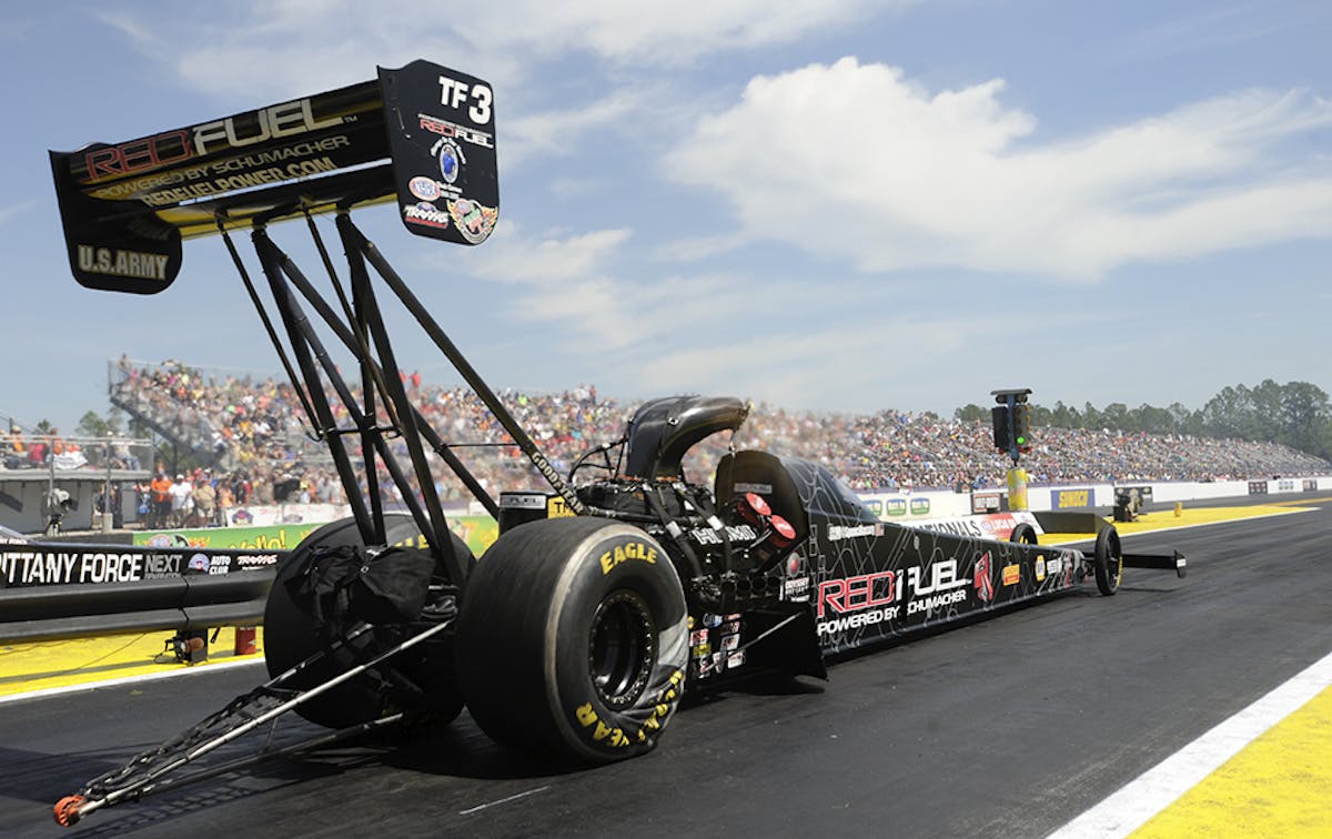 Massey piloted his Red Fuel dragster to a holeshot victory, winning with a performance of 3.882 seconds at 320.74 mph to defending world champ Tony Schumacher’s quicker but losing 3.873 at 313.29 in the U.S. Army dragster. It was Massey’s first win at Gainesville and 18th of his career. The victory moves Massey into a tie with Shirley Muldowney and Darrell Gwynn for 12th on the all-time wins list in Top Fuel.