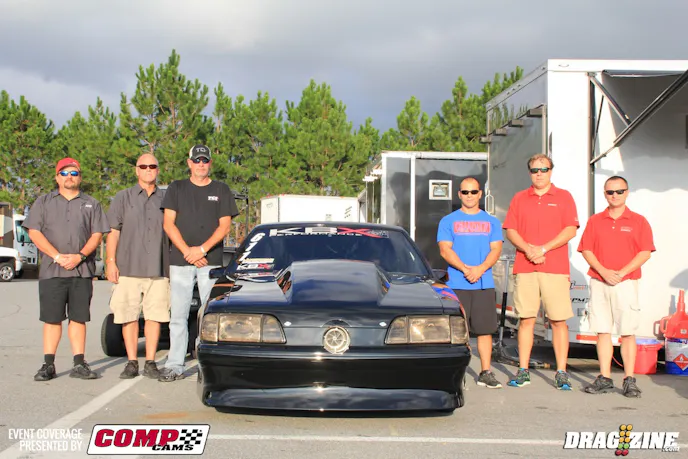 Taylor Lastor is here running two classes this weekend. He is entered in X275 with his Camaro and brought out a brand new Jerry Bickel NHRA/Pro Nitrous type chassis. Camaro that isn't quite finished yet. The first runs on the car were this weekend and the TRE crew is working the bugs out. The engine is also a brand new piece sporting 903 cubic inches of TRE horsepower backed by a TH 400. The X275 car also has a new engine using new cylinder heads from Edelbrock. Shown from left to right: Brian Sandlin,  Kenner Spears, Steve Benoit, James Kimball, Taylor Lastor and Reggie Richard.