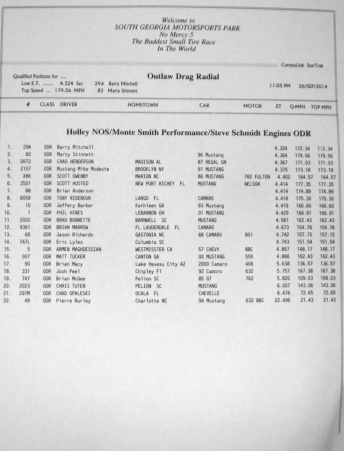 Barry Mitchell is number one in Outlaw 275 with a 4.26 at 173 and Outlaw Drag Radial with a 4.32 at 172.