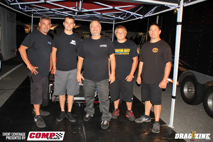 Martin Shows has a new Fulton 738 purchased from Barry Mitchell. So far Alex has been a 4.48, a 4.47 and a 4.45 testing yesterday. So far so good for the father and son team. Also on board is Pressurized Solutions who did the new Zoomie style headers, Induction Solutions, Team Z Motorsports, Pro Lite Batteries and Mark Menscer shocks and struts. From left to right, Dusty Right, Alex Shows, Josh Sullivan, Wesley Ashley and Josh Thorton. Alex's father Martin is not shown.